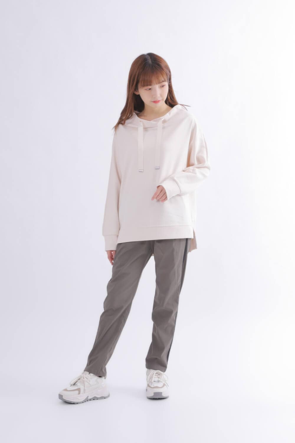 カジュアルになりがちなスウェットを程よいデコルテ見せでグッと女性らしい印象に。フードは無く、フロントの太めのリボンが上品さをプラスしています。