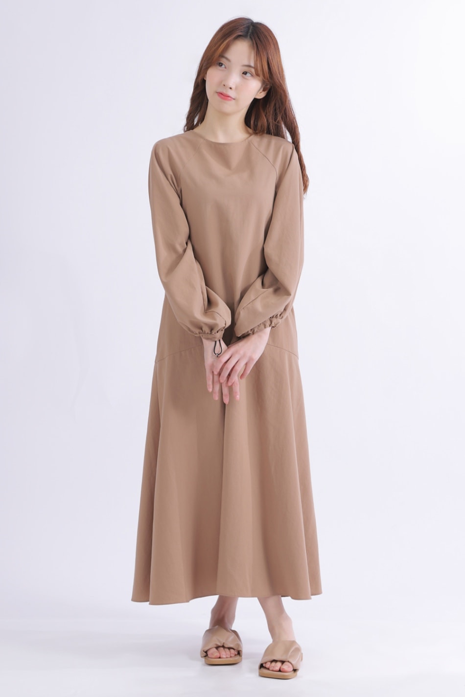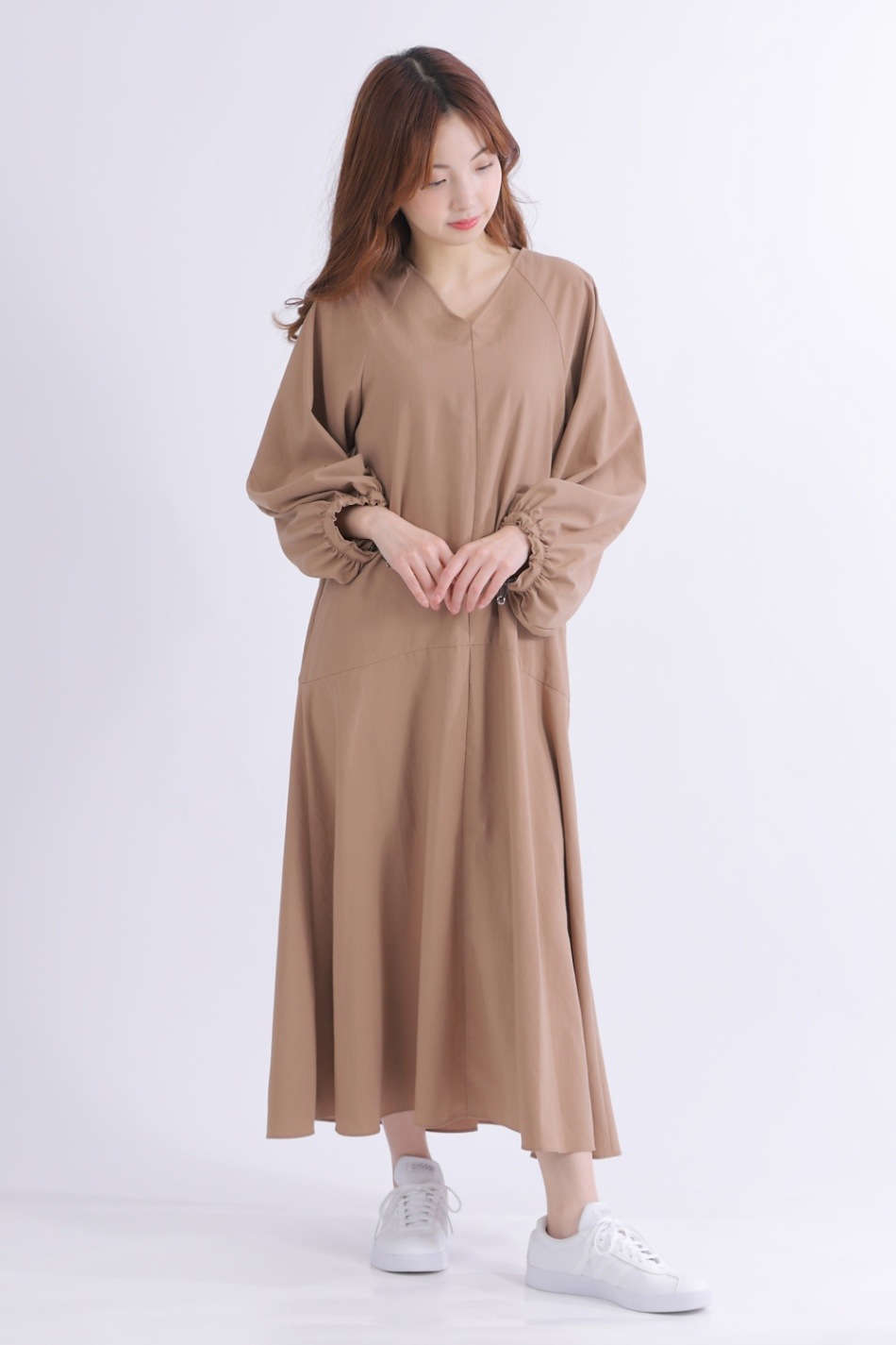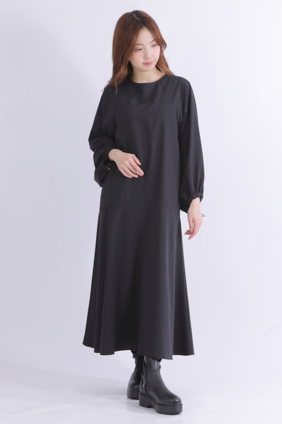 し、さりげなく女性らしさをプラスしたロング丈ワンピース。